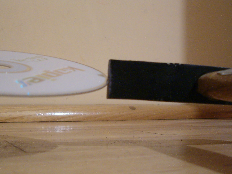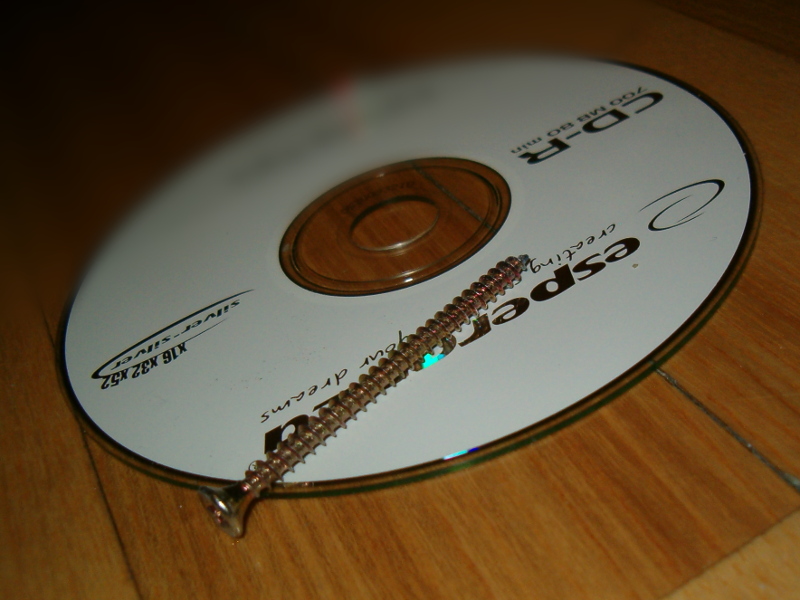 In order to destroy the disc, get something hard and pointy. A screw is just the thing. Look at figure 1 for an example.